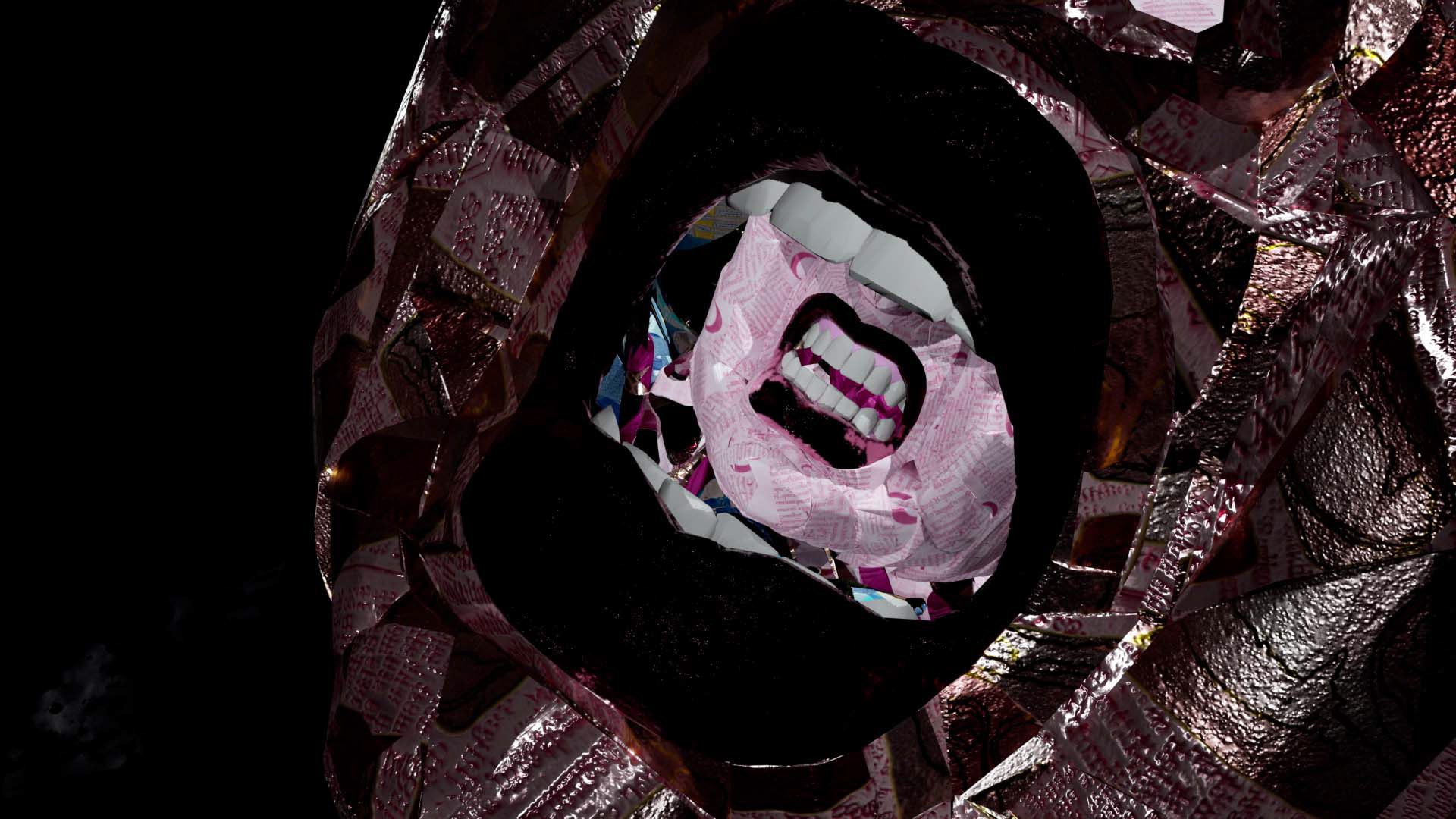 "In the beginning, there was no beginning". Take a deep breath while we undrown. The masks we wear have minds of their own. The mind is a negotiated idea. The body is a veil, peeling away. Don't look away, look in every direction at once. When fracturing, every angle is important.
